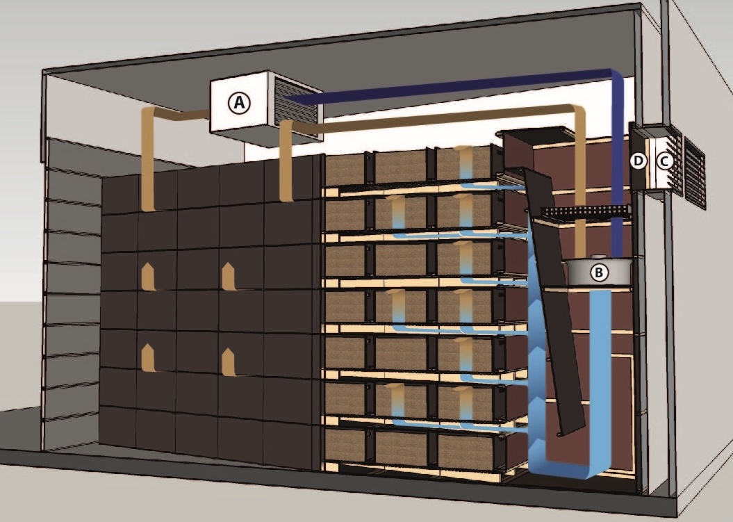 Links een voorbeeld met stalen boxen, die individueel worden belucht. De vochtige lucht wordt aan de achterzijde aangezogen en circuleert door de zaden.