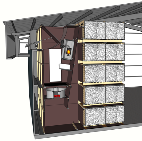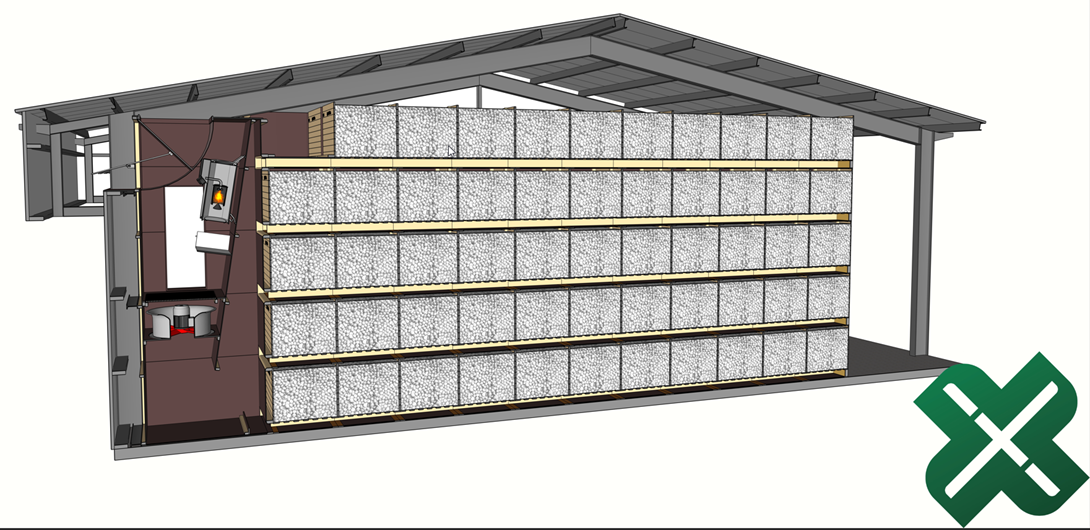 Voorbeeld drooginstallatie met kisten 5 hoog gestapeld
