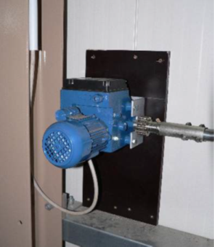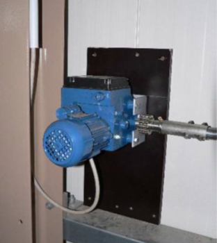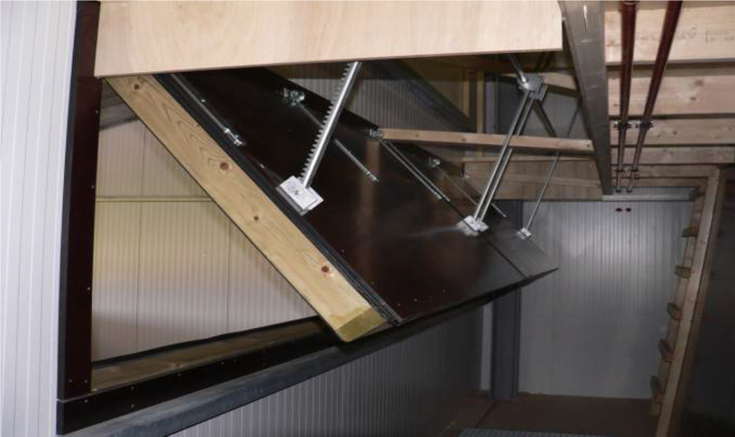 Voorbeeld van een geïsoleerd luik met tandheugels en motor om het luik automatisch te openen.