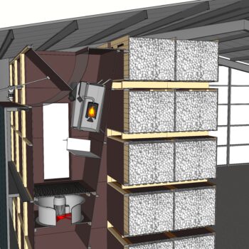 De openingen aan de voorzijde van het luchtverdeelsysteem sluiten perfect aan op de opening van elke kist pallet. Buitenlucht wordt aangezogen via een opening in de achterwand. Wanneer de buitenlucht te vochtig is, wordt de binnenlucht gerecirculeerd om optimale droogomstandigheden te behouden.