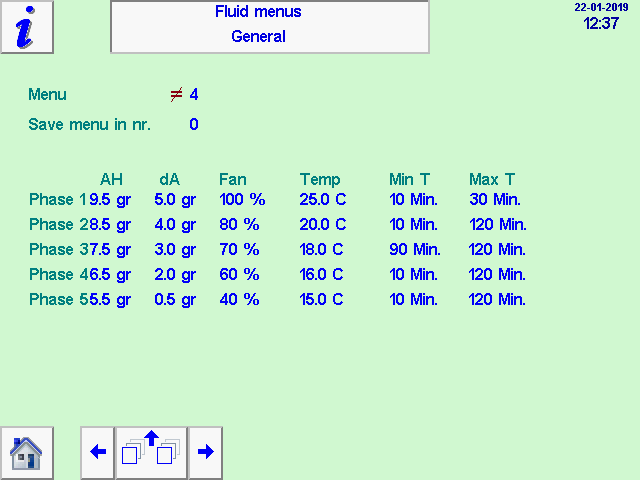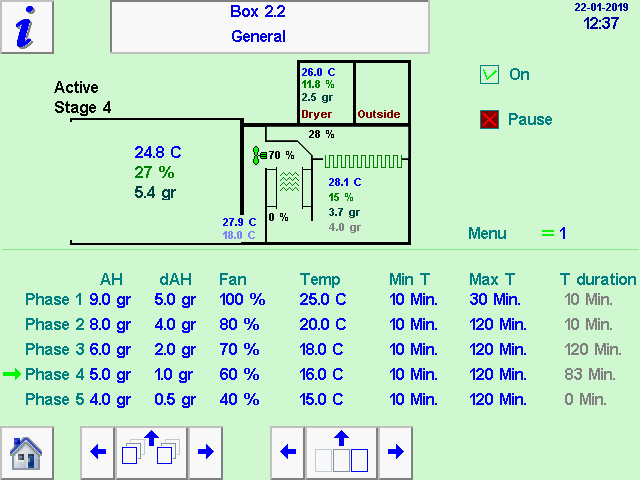 Instellingen per individuele kist; per fase van de gewenste luchtvochtigheid, temperatuur, minimale en maximale droogtijd.