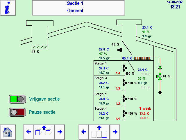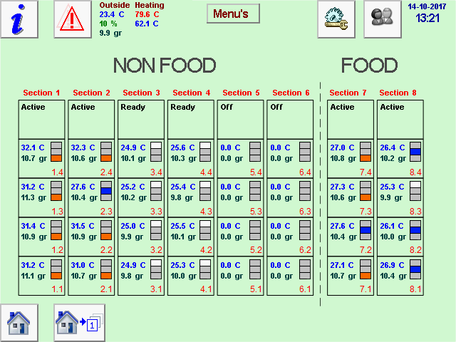 Hier ziet u een voorbeeld van ABC-software voor een installatie waarbij elke kist individueel gedroogd kan worden. De installatie bestaat uit acht secties met vier kisten. Er wordt een pictogram voor een kist weergegeven, met informatie over de luchtkwaliteit, de absolute vochtigheid en de temperatuur van het product.
