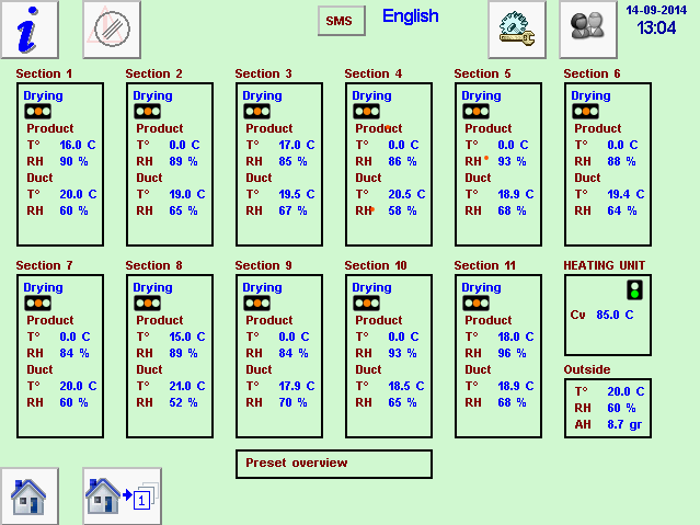 Op de afbeelding een voorbeeld van een drooginstallatie met 11 secties lucht verdeel systemen met centrale verwarming. Per sectie is informatie zichtbaar over de statussen en de gemeten waarden.