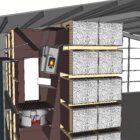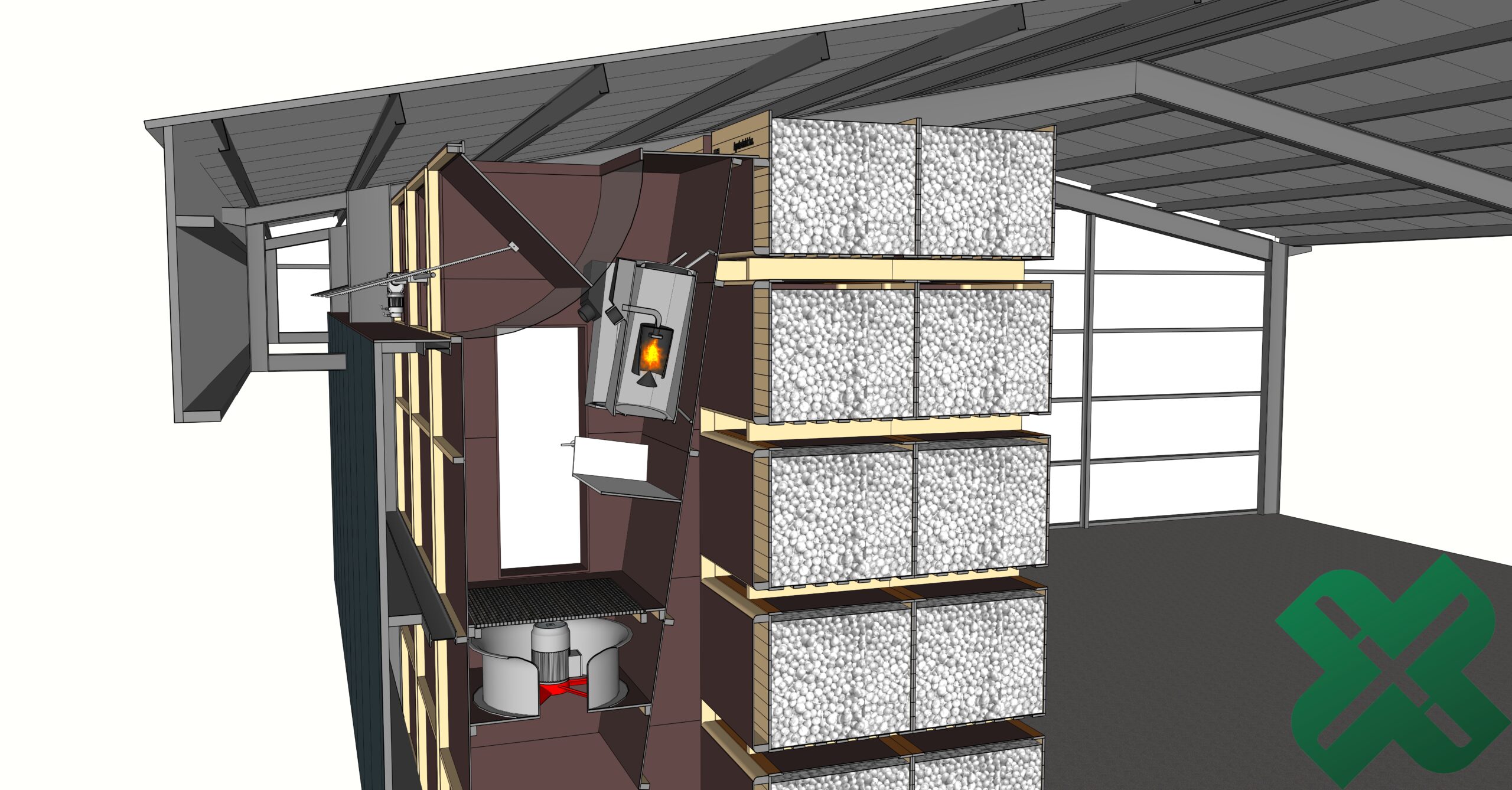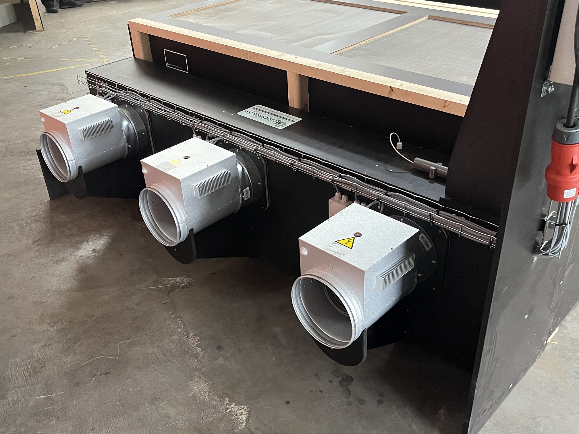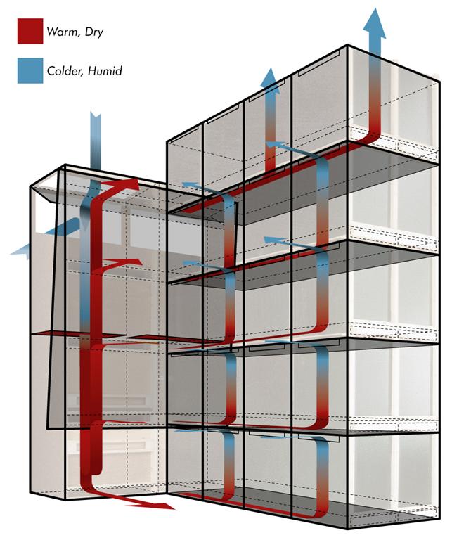 De openingen aan de voorzijde van het luchtverdeelsysteem sluiten perfect aan op de opening van elke kist pallet. Buitenlucht wordt aangezogen via een opening in de achterwand. Wanneer de buitenlucht te vochtig is, wordt de binnenlucht gerecirculeerd om optimale droogomstandigheden te behouden.