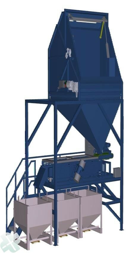 Right: An inverter with dosingbunker and feeder to a calibrating/sieveinstallation.